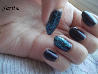Lakier ogólnie: Jak już wspomniałam jest to niebieski brokat w przezroczystej bazie. Kolor od razu mi się spodobał, dlatego też go chwyciłam. Niestety ma okropny zapach. Śmierdzi klejem. Ale to chyba jego jedyny minus. Nie próbowałam go użyć solo. Zmywanie jak to brokaty. Użyłam metody foliowej.